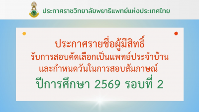 - ประกาศรายชื่อผู้มีสิทธิ์รับการสอบคัดเลือกเป็นแพทย์ประจำบ้าน และกำหนดวันในการสอบสัมภาษณ์ ปีการศึกษา 2569 รอบที่ 2