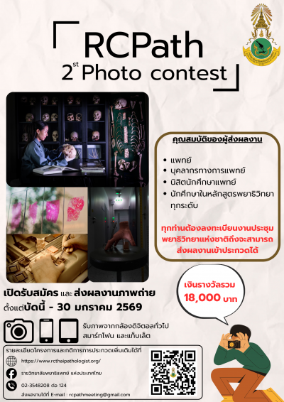- ขอเชิญส่งผลงานประกวดภาพถ่ายที่เกี่ยวข้องกับงานพยาธิวิทยาและนิติเวชศาสตร์ ครั้งที่ 2 RCPath 2st Photo Contest