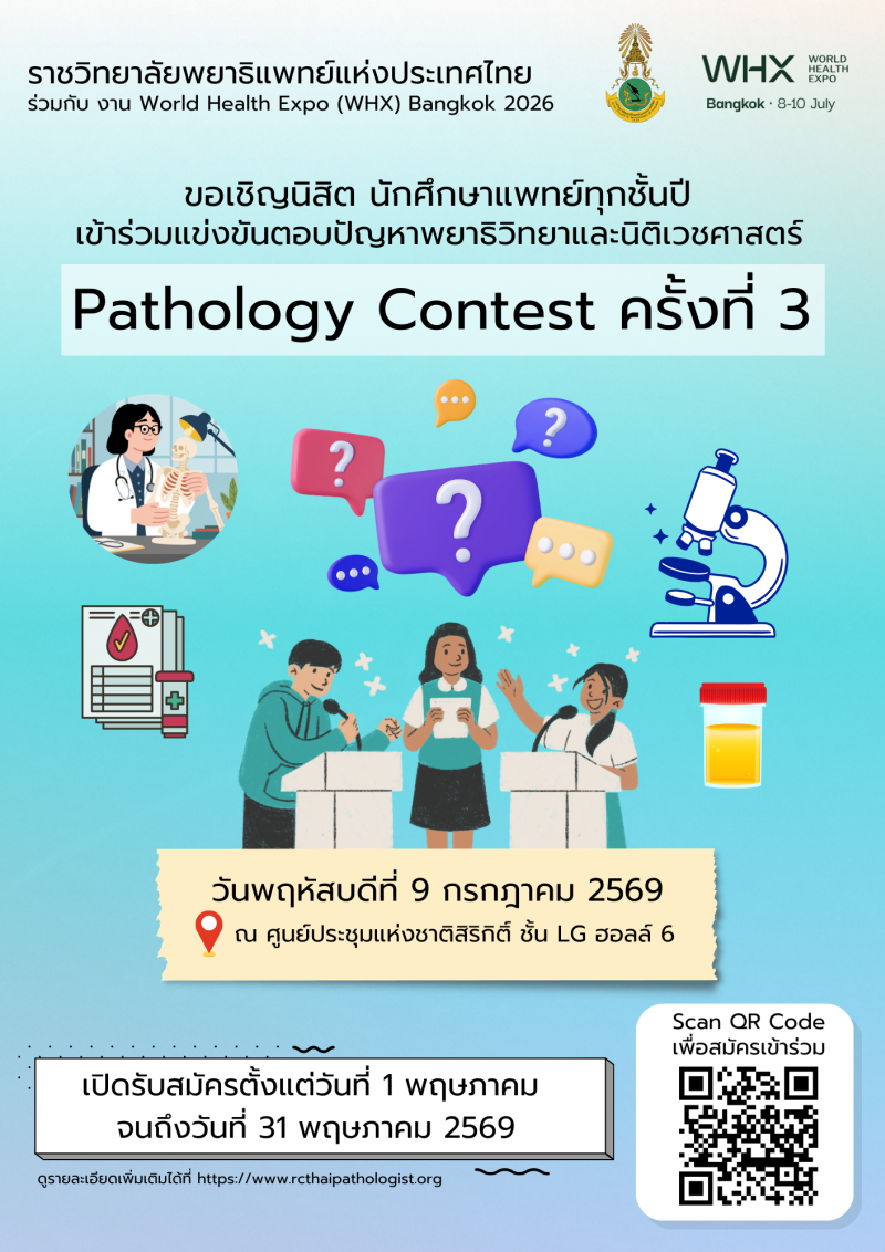 ขอเชิญนิสิต นักศึกษาแพทย์ทุกชั้นปี เข้าร่วมแข่งขันตอบปัญหาพยาธิวิทยาและนิติเวชศาสตร์ Pathology Contest ครั้งที่ 3 ราชวิทยาลัยพยาธิแพทย์แห่งประเทศไทย