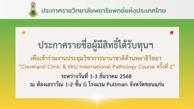 - ประกาศรายชื่อแพทย์ประจำบ้าน ที่ได้รับทุนเพื่อเข้าร่วมงานประชุมวิชาการนานาชาติ Cleveland Clinic & KKU International Pathology Course ครั้งที่ 2
