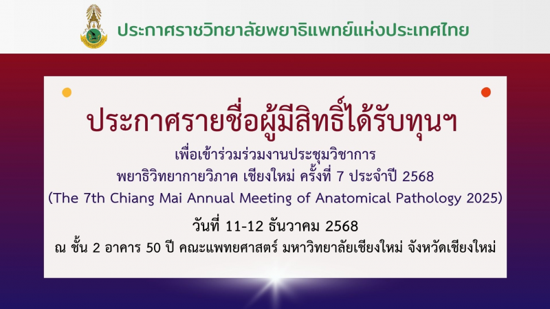 - ประกาศรายชื่อแพทย์ประจำบ้าน ที่ได้รับทุนเพื่อเข้าร่วมงานประชุมวิชาการ ครั้งที่ 7 ประจำปี 2568 (The 7th Chiang Mai Annual Meeting of Anatomical Pathology 2025)