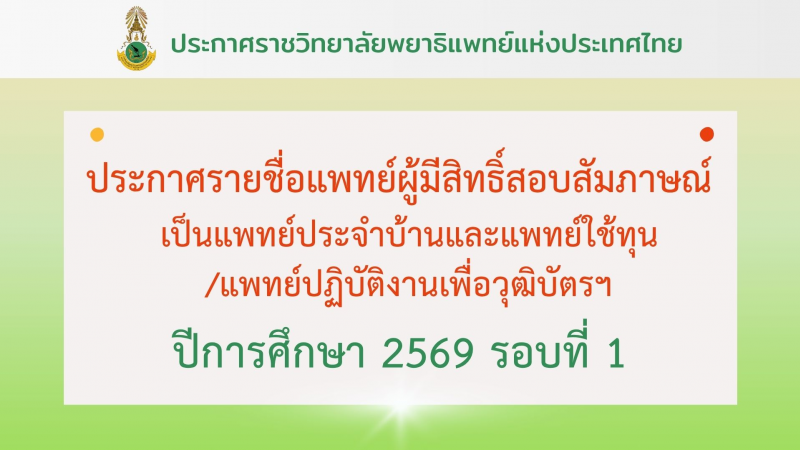 ประกาศรายชื่อแพทย์ผู้มีสิทธิ์สอบสัมภาษณ์เป็นแพทย์ประจำบ้านและแพทย์ใช้ทุน/แพทย์ปฏิบัติงานเพื่อวุฒิบัตรฯ ปีการศึกษา 2569 รอบที่ 1
