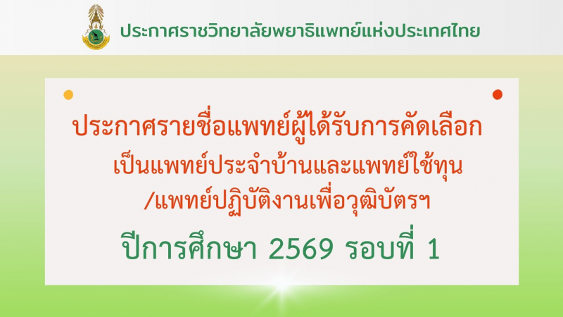 ประกาศรายชื่อแพทย์ผู้ได้รับการคัดเลือก เป็นแพทย์ประจำบ้านและแพทย์ใช้ทุน/แพทย์ปฏิบัติงาน เพื่อวุฒิบัตรฯ ประจำปี 2569 รอบที่ 1